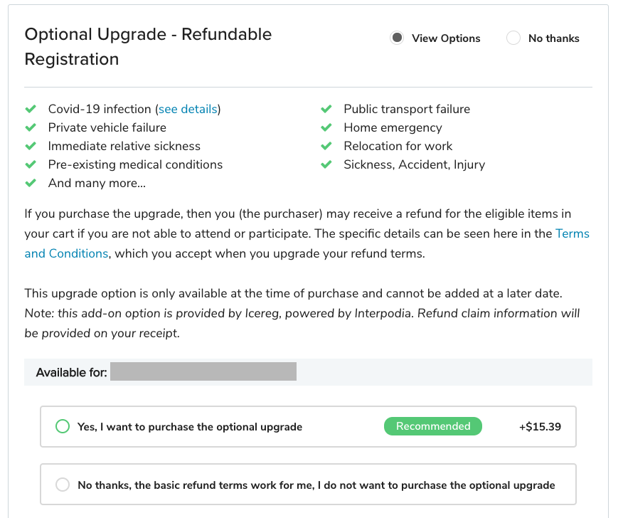 Registrants are seeing "Optional Upgrade - Refundable registration" in their cart; what does that mean? Is there any impact on my organization?