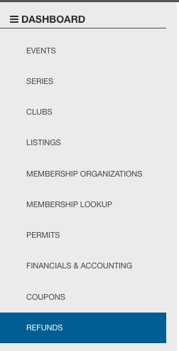 Every event has a report in the Financial Reports section called Refunds. This report will show all the refunds for that event and show the information contained in the on-screen refund details (above) in an Excel .CSV report format. This section will show you how to get to the refund reports.- From your dashboard select the events tab on the left hand side of your screen.