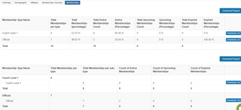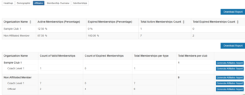 This tab allows to look into the statistic of your affiliated organizations You will be able to download reports for all of the memberships either by organization or by memberships.