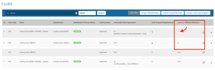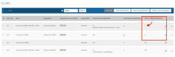 3- This will bring you to the "Affiliate /Club" tab which will give you a total count of members that have affiliated with your organization, and allow you to view and search for individual members.