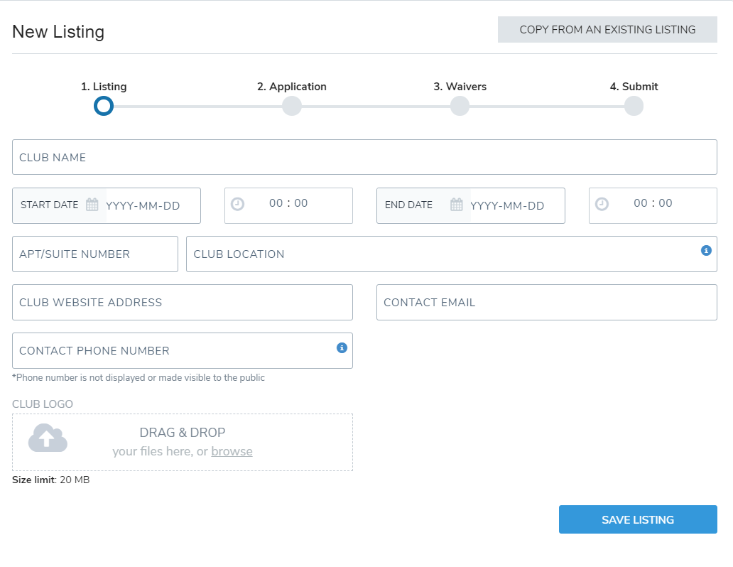 2. Copy or enter you club information and click on save listing & save and continue