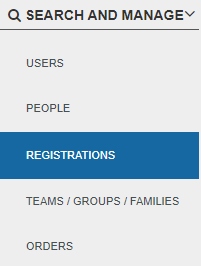 - Click the "Registrations" tab under "Search and Manage" to specify your search by registration. You may enter search criteria to find a specific registration (by F Name, L Name, or email) or you can leave the search field blank to pull up all registrations.