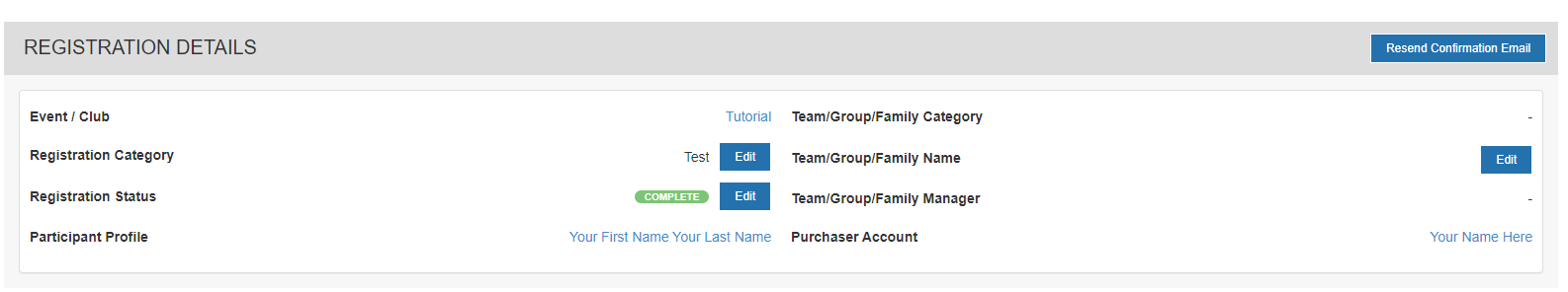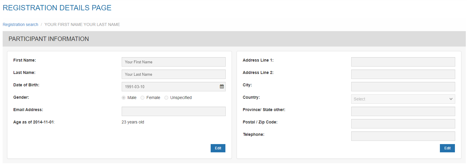 - After selecting a registration, on the registration details page you are able to modify the participant details (Name, Email, DOB), the participant address, and any survey questions answered during registration. If a modification is made, be sure to click the blue "Save" button to apply your changes.