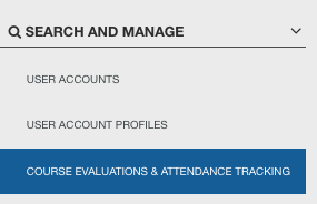 To access the COURSE EVALUATIONS & ATTENDANCE TRACKING menu, simply navigate to your admin dashboard and find the 'COURSE EVALUATIONS & ATTENDANCE TRACKING' option in the left side menu under the 'Search & Manage' section.