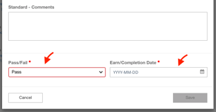 - Apply 'pass' or 'fail' mention > If Pass, enter the Earn/Completion Date