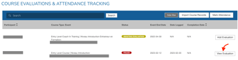 To access the list of records from the same menu, simply navigate to the COURSE EVALUATIONS & ATTENDANCE TRACKING menu. If an evaluation has already been completed, you will now have the option to click on the 'View Evaluation' button. This will allow you to view the completed form and make any necessary adjustments to the 'Notes' (also known as Standard - Comments).