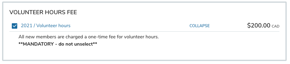 - ALL new member: must select the volunteer hours fee MANDATORY (the system will pre-select you for you)