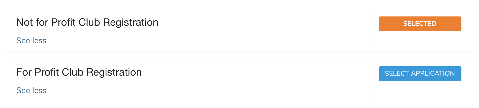The first step is to select if you are completing this application for an Not For Profit or a Profit Club.