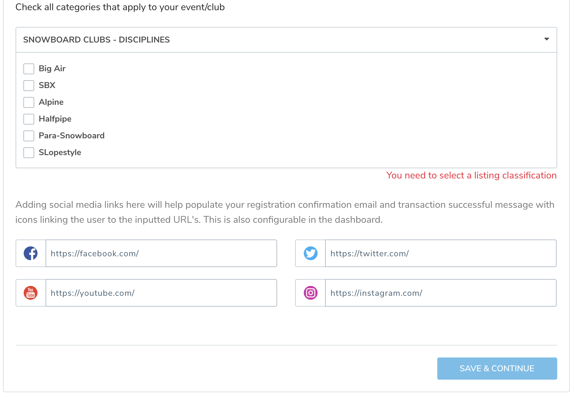 Then, you will be prompted to select your listing classification and to add your social media links. Choosing the appropriate classification will help the registrant find your event/club more easily in the search function of your directory.