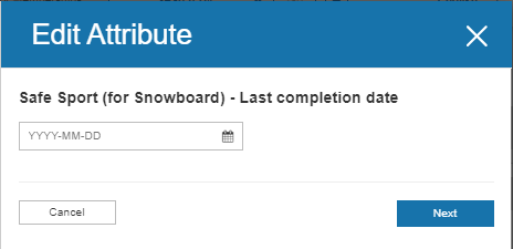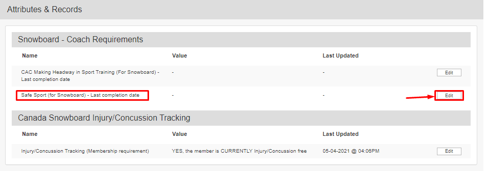 - Under Attribute & Records click edit for the Safe Sport (for Snowboard) - Last completion date attribute