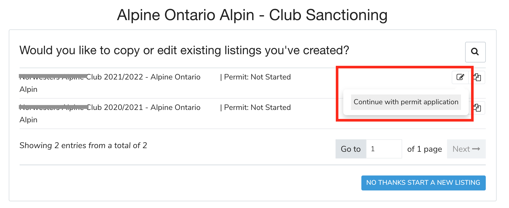 Your 2021/2022 listing already exists, it's been created for you by Snowreg, please select the existing one, all your existing listing/application will show up as below: