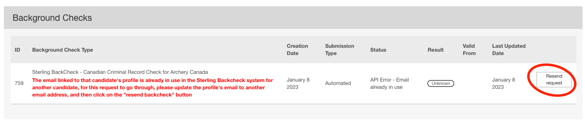 This error occurs when the email linked to that candidate's profile is already in use in the Sterling Backcheck system for another candidate. For this request to go through, please update the profile's email to another email address and then click on the "resend request" button