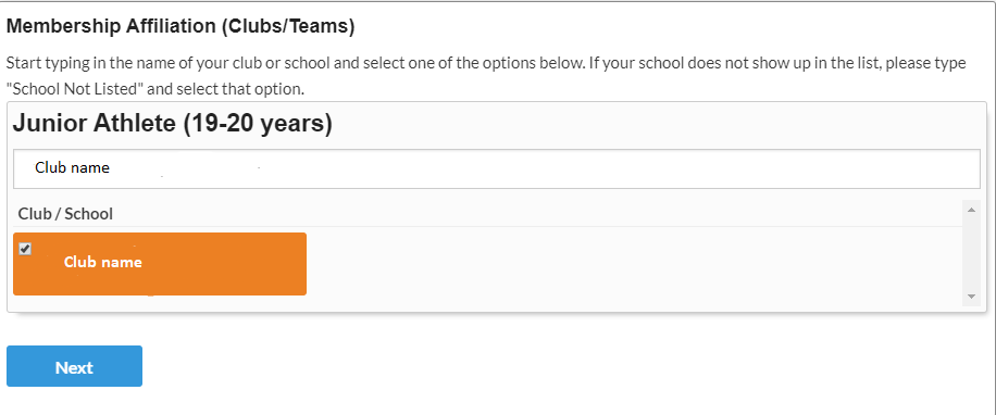 - If you need your athletes to be affiliated to a club, look for the club's name when you reach the Membership Affiliation step
