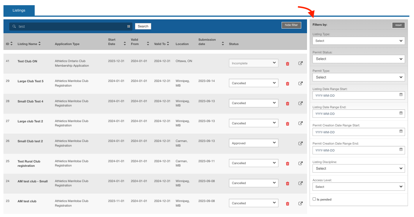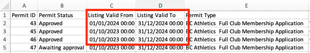 Please keep in mind that the report will show all club applications since you started using the system, as we follow the same process every year. To view only the listings for the current season, you can download the ALL TIME report and apply filters based on the "listing valid from" and "listing valid to" dates found in columns C and D. These dates indicate the duration of the club membership and when the listing appears in your directory.