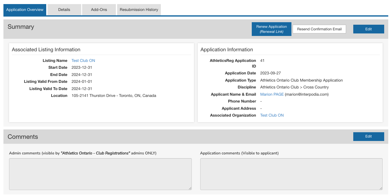 - The Application Overview tab provides a comprehensive overview of the clubs' main information. It also offers a convenient area where you can keep track of additional details by leaving notes, sending emails to the applicant, or attaching additional documents.