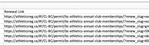 - In the report type you select, look for the last column of the report labeled "Renewal Link". Each club has unique renewal links that should be shared with your club administrators. Make sure to use the one from the most recent application!