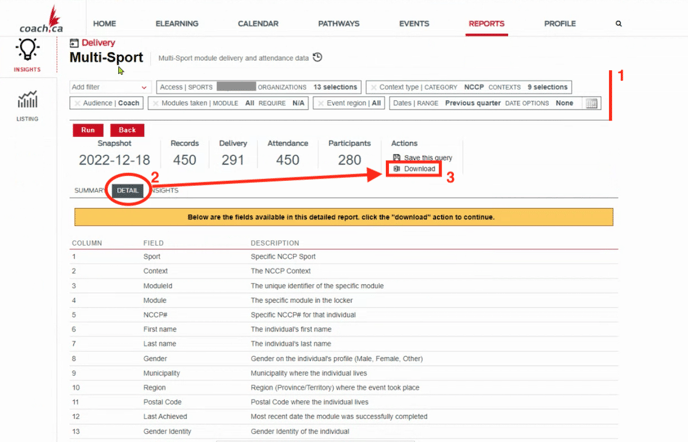 - Select the report type (e.g., "Multi-sport") and apply filters by module or date if needed.