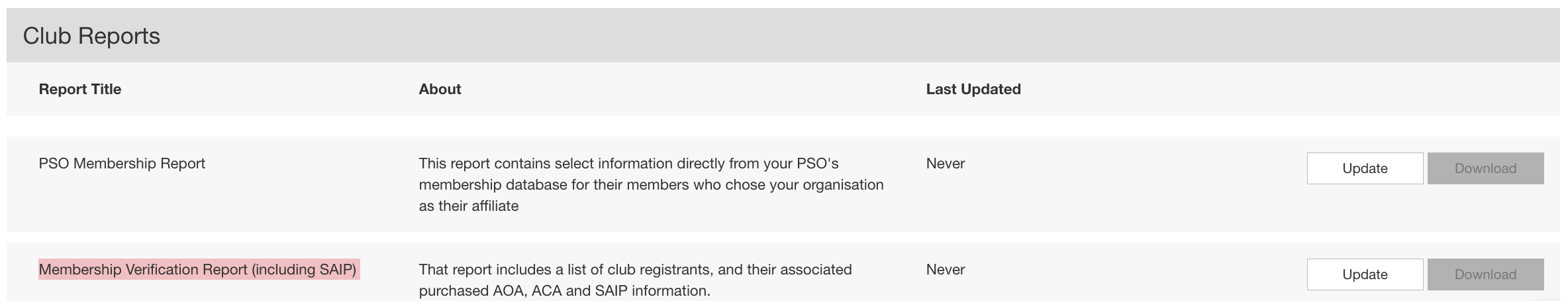 4- Scroll down to the 'Club Reports' section, then update and download the 'Membership Verification Report (including SAIP)' report