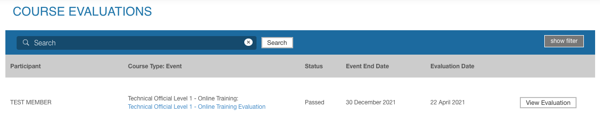 - Go to the course evaluation menu to complete the member's evaluation (pass/fail), you can also add the grade and some feedback in the Technical Official Level 1 - Online Training Evaluation GRADE & FEEDBACK section if needed.