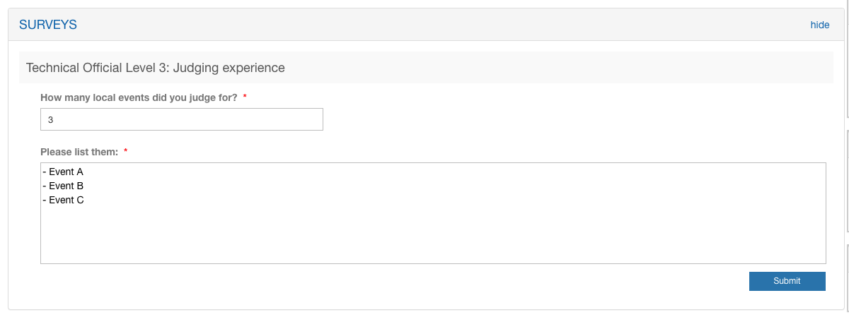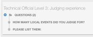 - One registration details page, accessible from the dashboard home - manage registrations buttonTechnical Official Level 3: Judging experience (Application form)