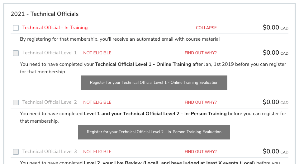 People can register for a Level, only once they've completed all the requirements for that level. If they have not completed at least one of the requirements, then the level will show as "not eligible" and the description will explain what the T.O needs to do to access that level: