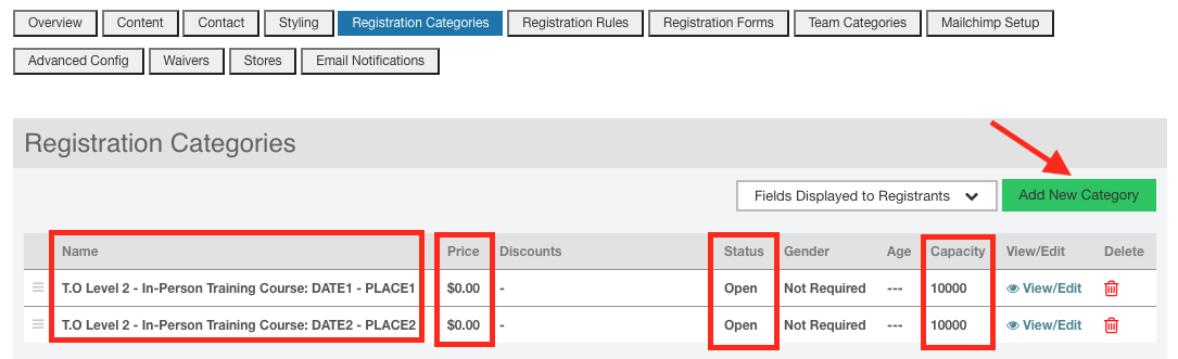 - Then, each time you've scheduled a new in-person training session, you need to update your "registration categories" tab:
