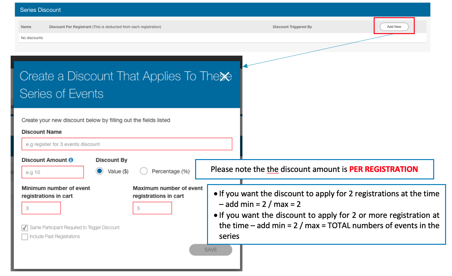 From the “series registrations discounts” you can create discounts for multiple registrations. Eg: If I register for 2 events at the same time, I get a $5 discount per event