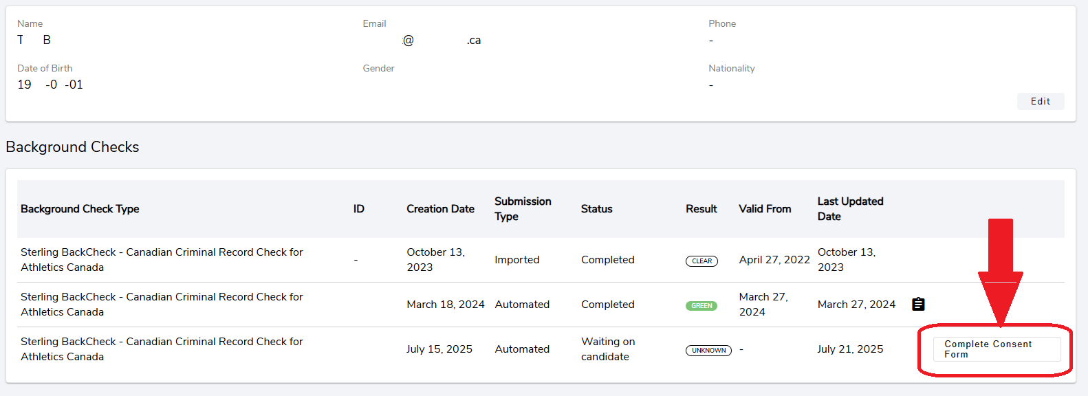 Upon initially requesting a background check, you will immediately receive an email from info@athleticsreg.ca with your invite to complete your background check through Sterling. The email subject is Reminder: Please complete your consent for the background check you purchased