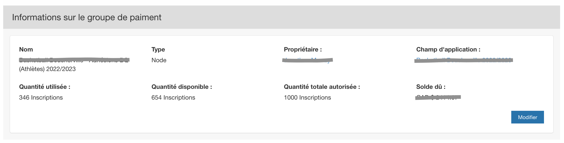 IMPORTANT : Seul le propriétaire du groupe de paiement peut supprimer une adhésion à un groupe de paiement. Pour savoir qui est le propriétaire du groupe de paiement, cliquez sur l'onglet Groupe de paiement dans le tableau de bord, ouvrez le groupe de paiement et consultez la section Informations sur le groupe de paiement :