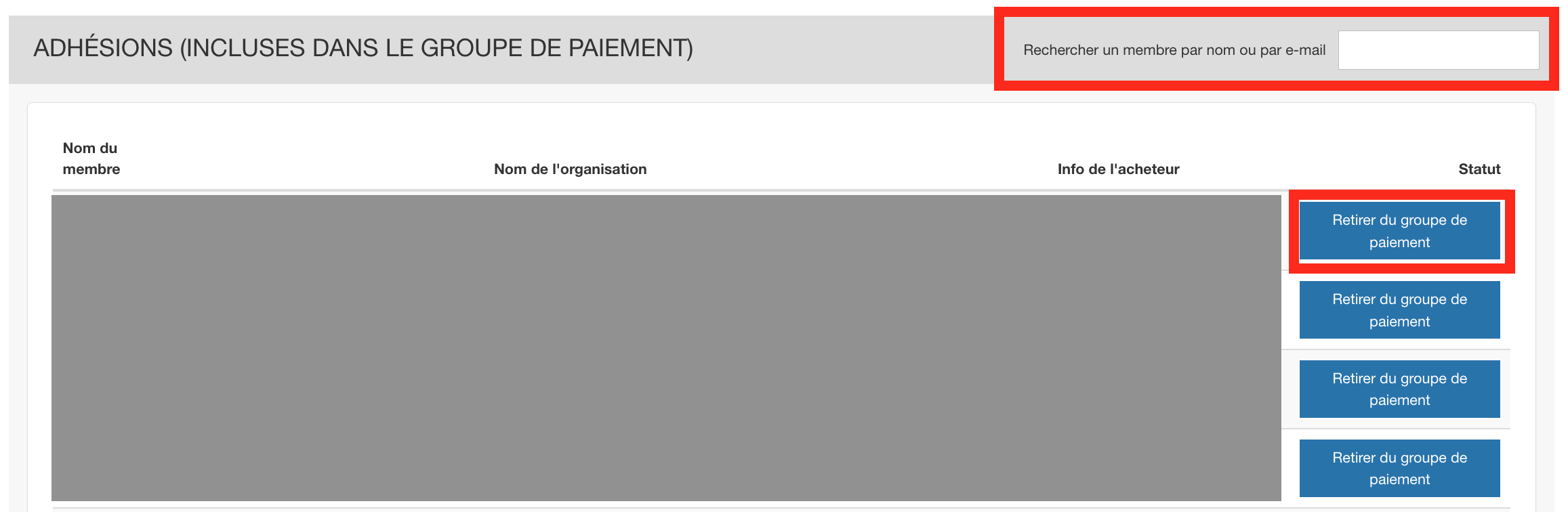 2- Une fois que vous êtes sur la page du groupe de paiement, faites défiler vers le bas de la page jusqu'à la partie "Les Adhésions". Vous y trouverez une barre de recherche, utilisez le prénom et le nom de la personne que vous souhaitez retirer de votre groupe de paiement, voir capture ci-dessous :