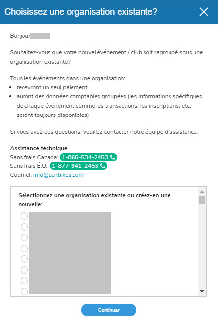 La nouvelle fonctionnalité pour les organisations existantes vous permet de sélectionner l'organisation (et compte financier) à laquelle vous souhaitez lier votre événement/club. Si vous réutilisez une organisation déjà existante sur votre compte, les fonds de votre événement/club seront transférés sur ce compte existant.