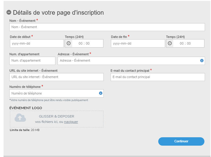 Email & numéro de téléphone: Ces détails de contacts seront publiés sur votre page d'inscription afin que les personne souhaitant s'inscrire ou inscrites puisse vous contacter pour demander des informations.