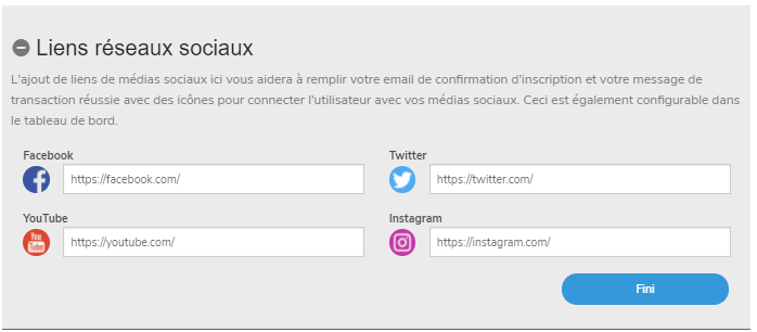 Si vous possédez des réseaux sociaux vous pouvez ajouter vos liens ici afin qu'ils soient faciles d'accès, ils seront disponibles depuis votre page d'inscription.