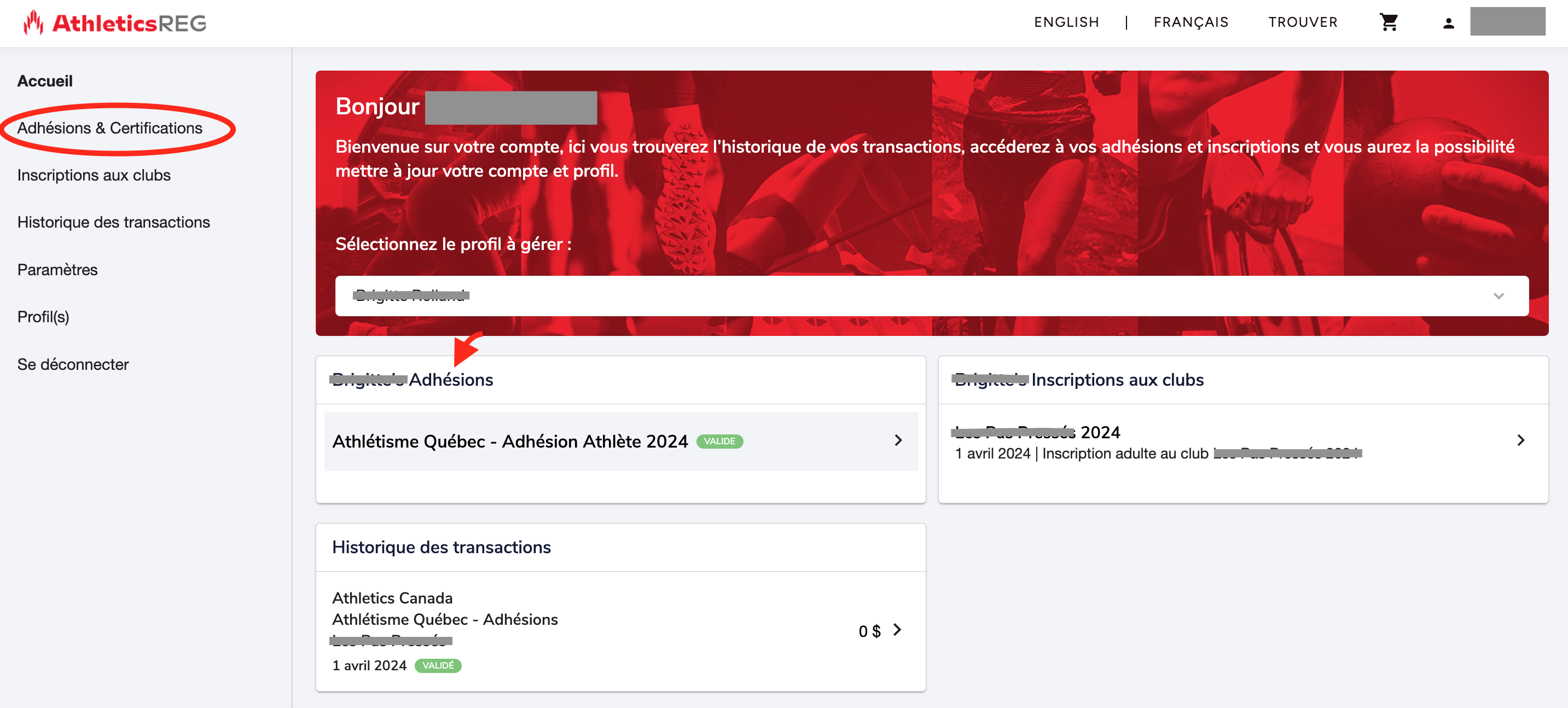 4- Pour mettre à jour vos informations d'adhésion, vous devez ouvrir les détails de votre adhésion provinciale (Athlétisme Québec dans l'exemple ci-dessus) qui comprennent :