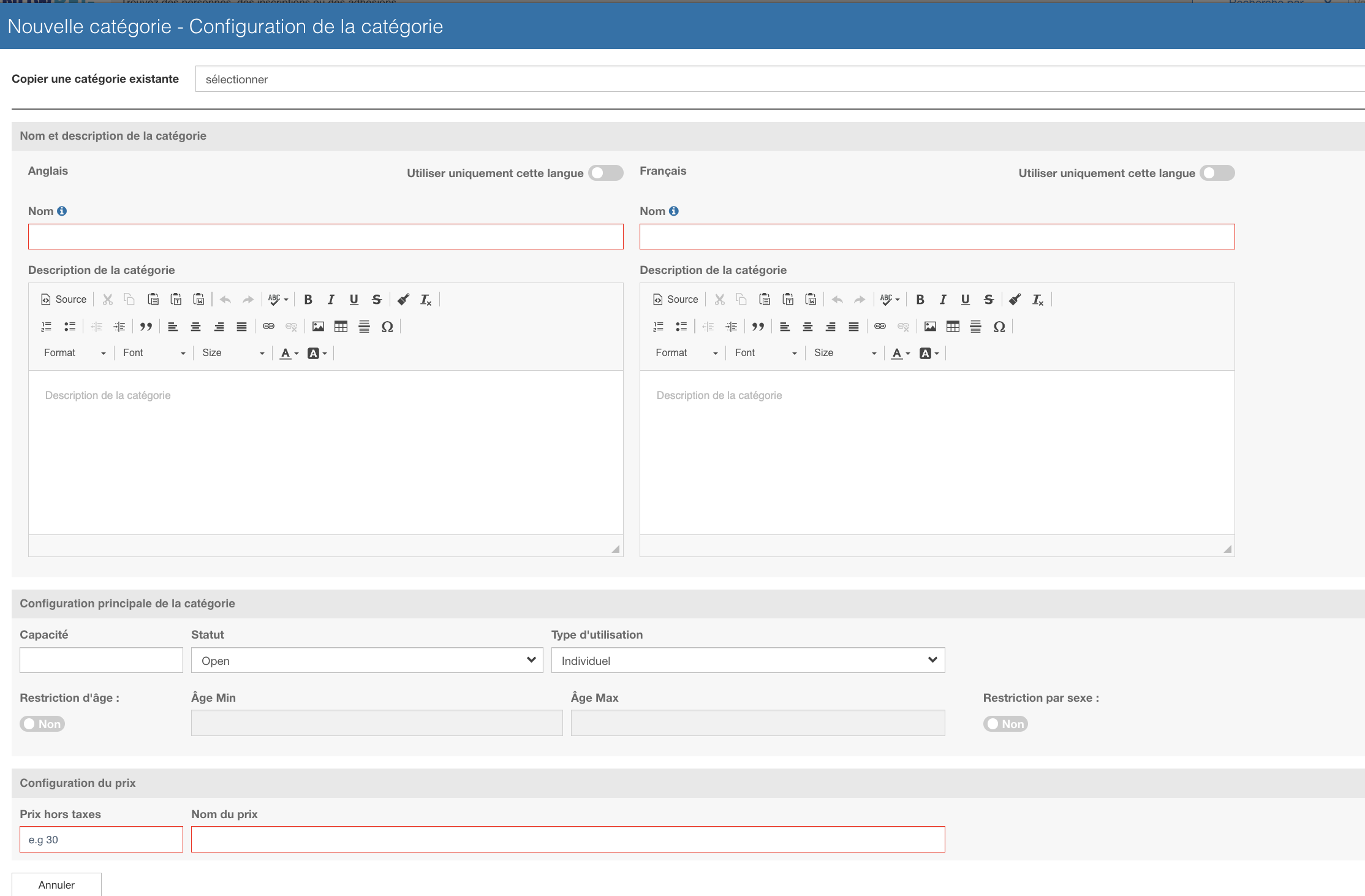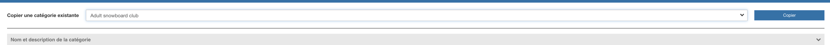 Conseil: Si vous avez déjà créé une catégorie similaire précédemment vous pouvez la réutiliser en sélectionnant copier une catégorie existante, les champs seront alors préremplis, vous pouvez les modifier à votre guise.