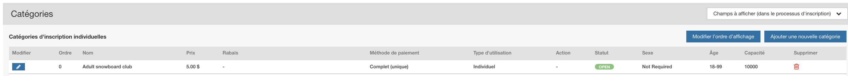 Capacité: La capacité maximale d'inscription à votre catégorie. Si la capacité de votre club ou événement en lui même est plus faible que ce que vous avez spécifié alors cette dernière est mise à jour.