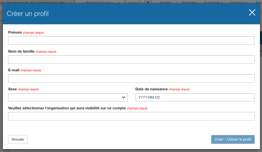 L'inscription que vous venez de créer est pratiquement vide d'informations autres que le nom, l'e-mail, la date de naissance et le sexe. Si vous le souhaitez, vous pouvez accéder aux détails de l'inscription et compléter l'adresse du participant et les questions supplémentaires le cas échéant.