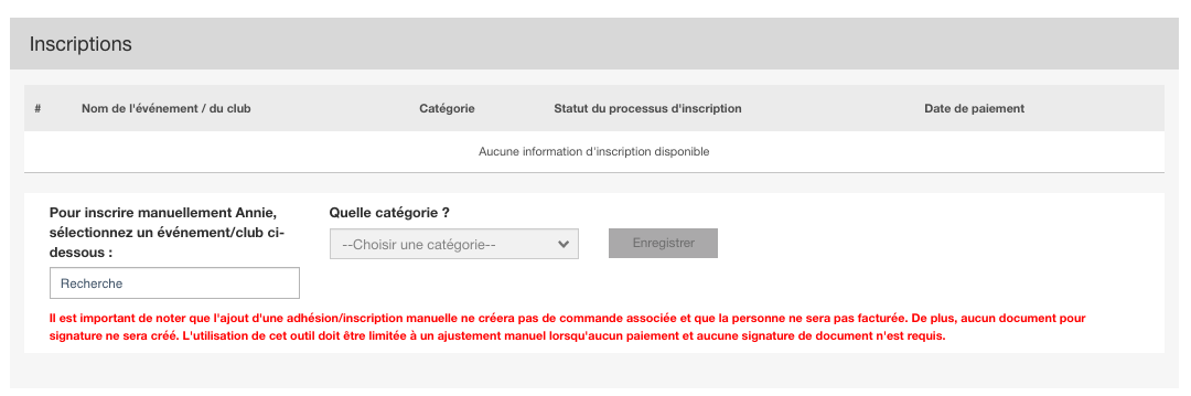 Si votre événement/club collecte des documents pour siganture auprès des participants, les documents NE SERONT PAS créée pour cette personne en ligne. Vous devez récupérer une copie papier auprès du participant.