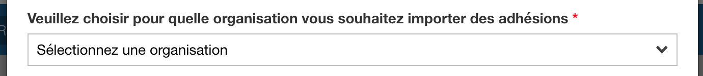 3- Sélectionnez le nom de l'organisation pour laquelle vous souhaitez importer des adhésions dans le menu déroulant - Assurez-vous de sélectionner la bonne affiliation au club