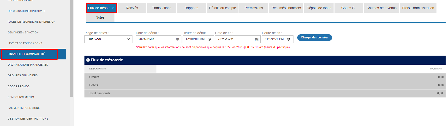 L'onglet par défaut est '' Flux de trésorerie '' et vous informe sur tous les fonds collectés et distribués à votre organisation.