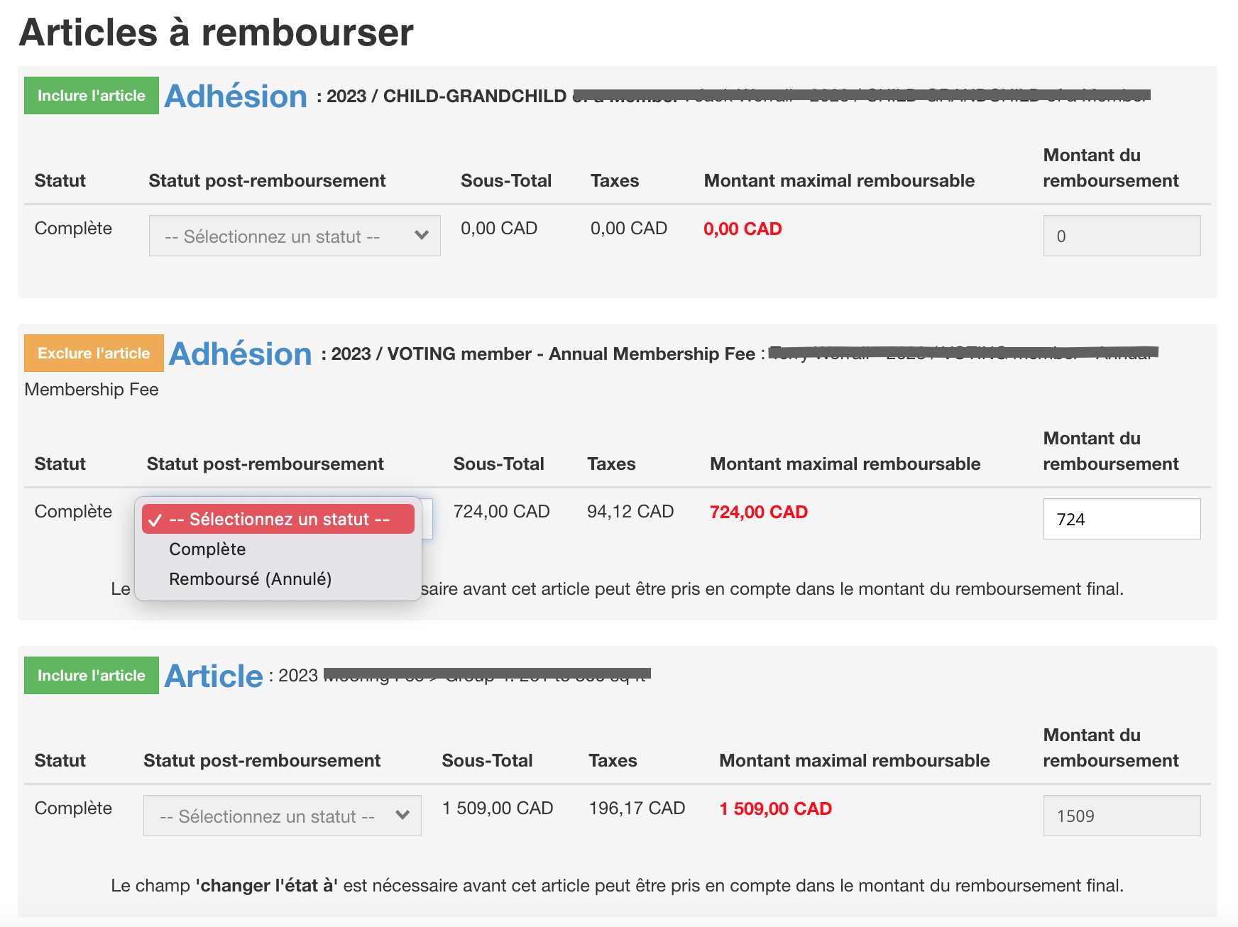 - Pour chaque article à rembourser, choisissez le nouveau statut du ou des articles : « Complète » ou « Remboursé (Annulé) » :