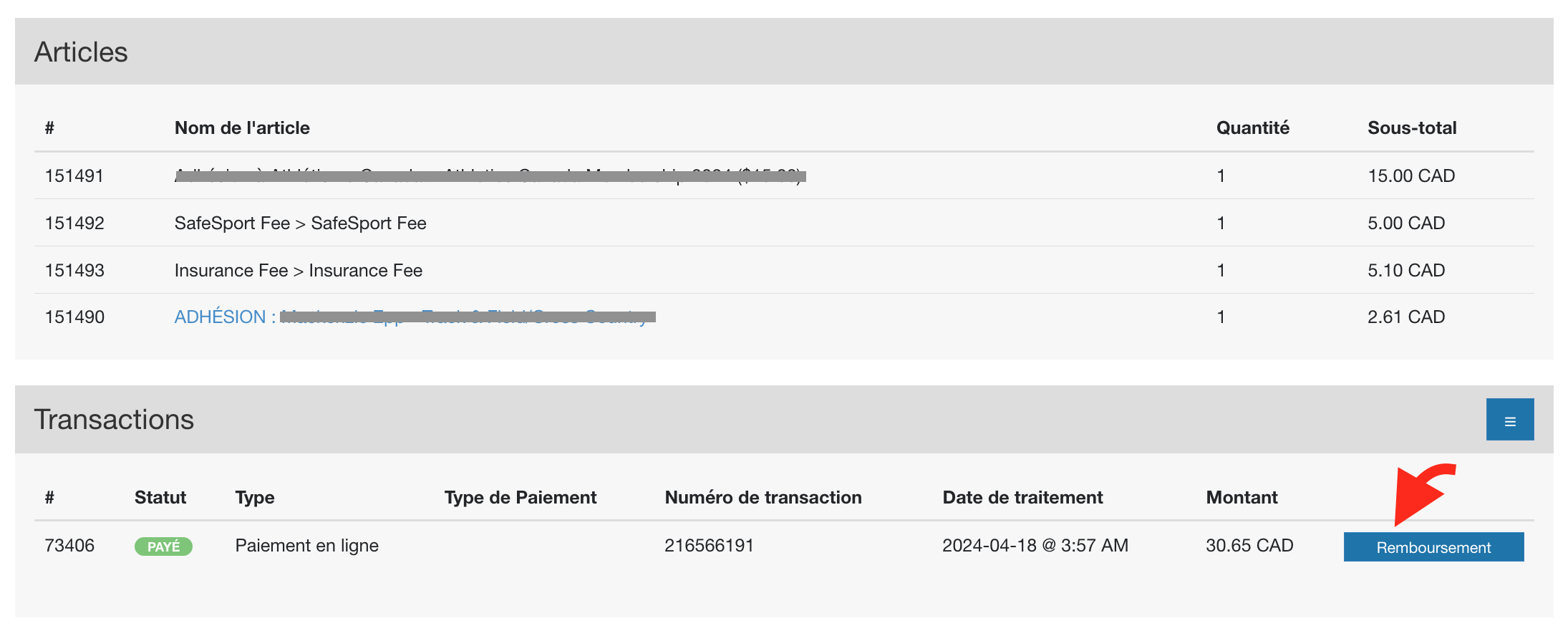 Après avoir trouvé la commande, ouvrez-la, accédez à la section Transactions dans les détails de la commande et sélectionnez le bouton Remboursement.