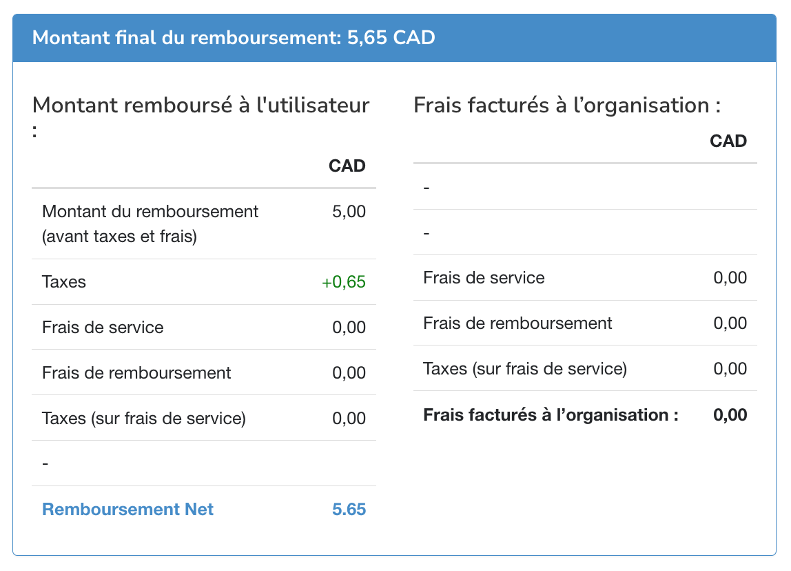 Une fois tous les champs obligatoires remplis, la section Montant à rembourser se renseignera avec les montants appropriés. Ces valeurs sont dynamiques et s'ajusteront en temps réel à mesure que vous modifierez les paramètres ou mettrez à jour le montant du remboursement.