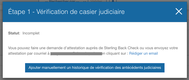 - Informations en attente du candidat: La demande a été envoyée à Sterling, mais le membre doit remplir son formulaire de consentement sur le site Sterling afin de procéder à sa demande de vérification des antécédents. Cette étape nécessite l'attention du membre pour faire avancer le processus.