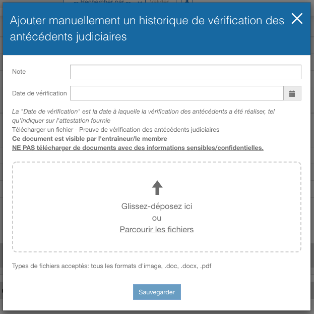 - N'ajoutez pas de documents confidentiels. Les fichiers sont stockés en toute sécurité mais ne sont pas cryptés. Les informations confidentielles ne doivent pas être incluses.