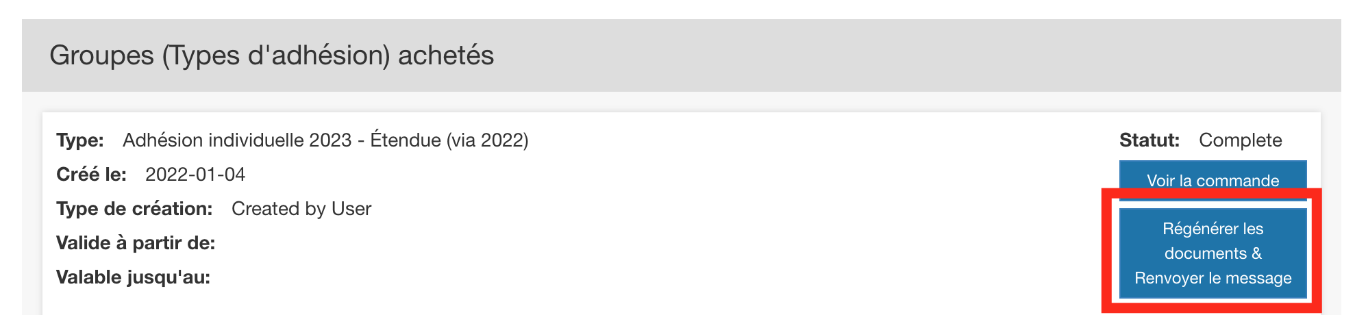 Pour renvoyer le document accompagné de l'e-mail de confirmation directement au membre, vous pouvez également sélectionner directement l'option « Renvoyer l'e-mail » dans la section « Groupes (Types d'adhésion) achetés » :