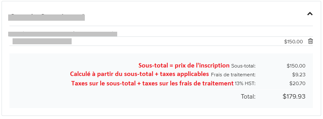 Le taux des frais de traitement dépend de votre contrat. Pour l'exemple ci-dessus les frais de traitement sont de 5% + $0.75 par inscription.