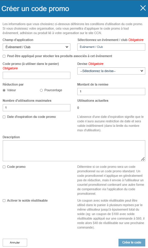 - Si vous êtes sur le point de créer un code promo pour compenser un paiement hors ligne, nous vous conseillons de nommer le code promo quelque chose d'évident.