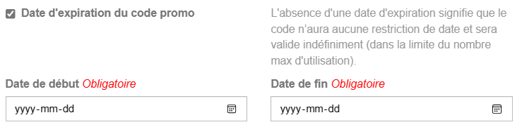 11. Sélectionnez si le coupon expire. Veuillez noter que l'expiration fait référence uniquement à la journée. Il n'y a pas de saisie d'heure comme la plupart des autres champs de date/heure du système Interpodia. Lorsque défini, le coupon expire le jour suivant la date qui est définie.