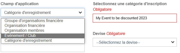 Entrez votre Événement/Club ; Organisation d'adhésion ; Organisation financière ; Catégorie d'inscription ; ou groupe d'organisations financières.